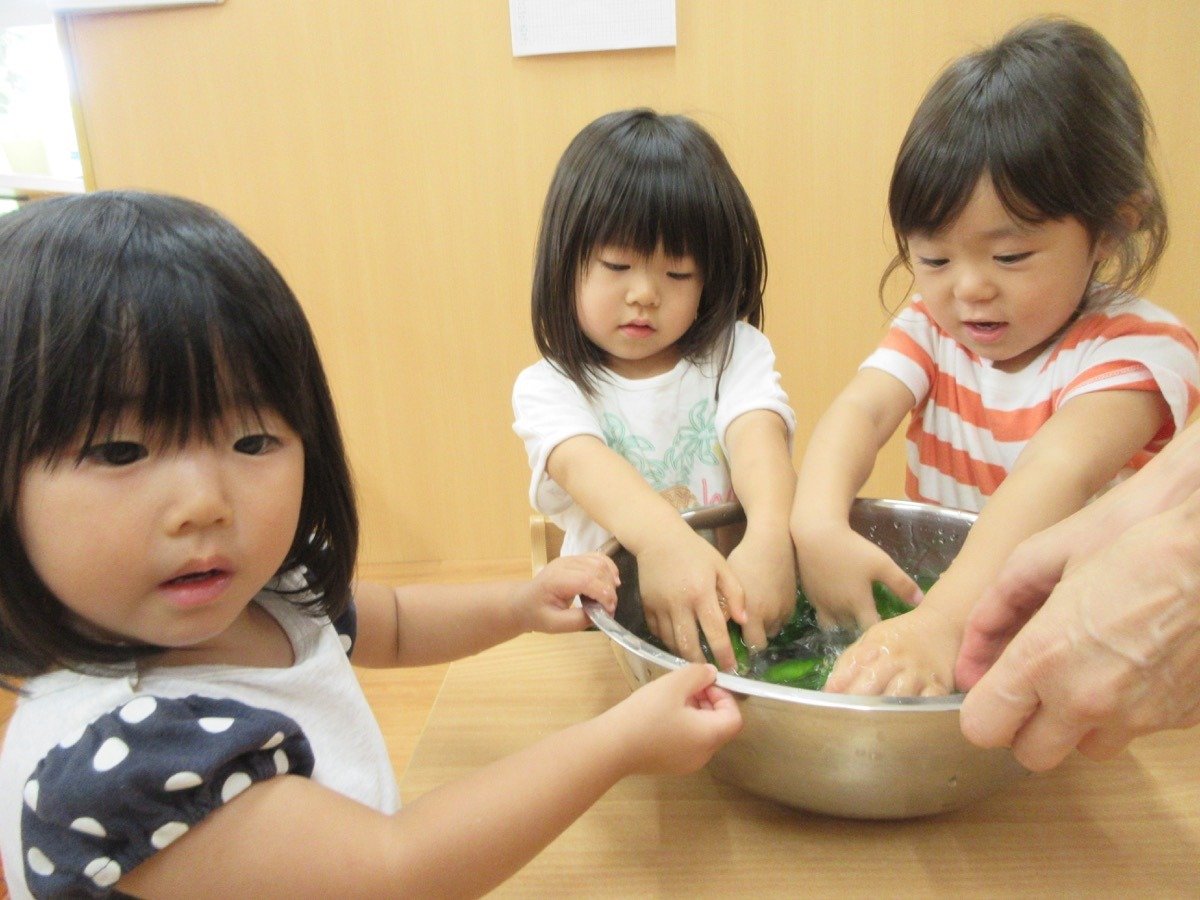 収穫したキュウリは自分たちで洗って、手のひらに塩をのせてもらい、