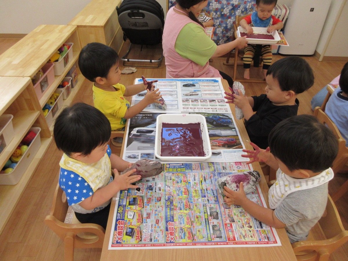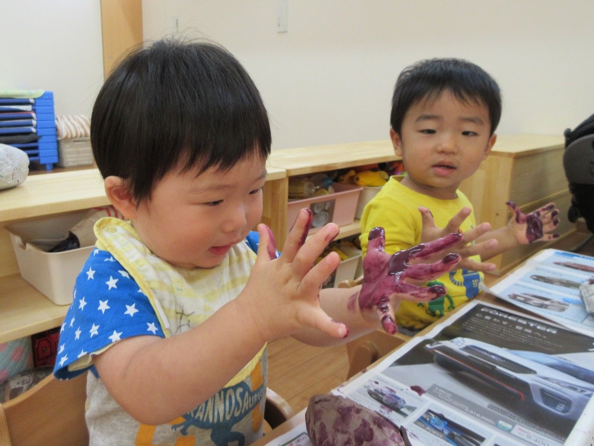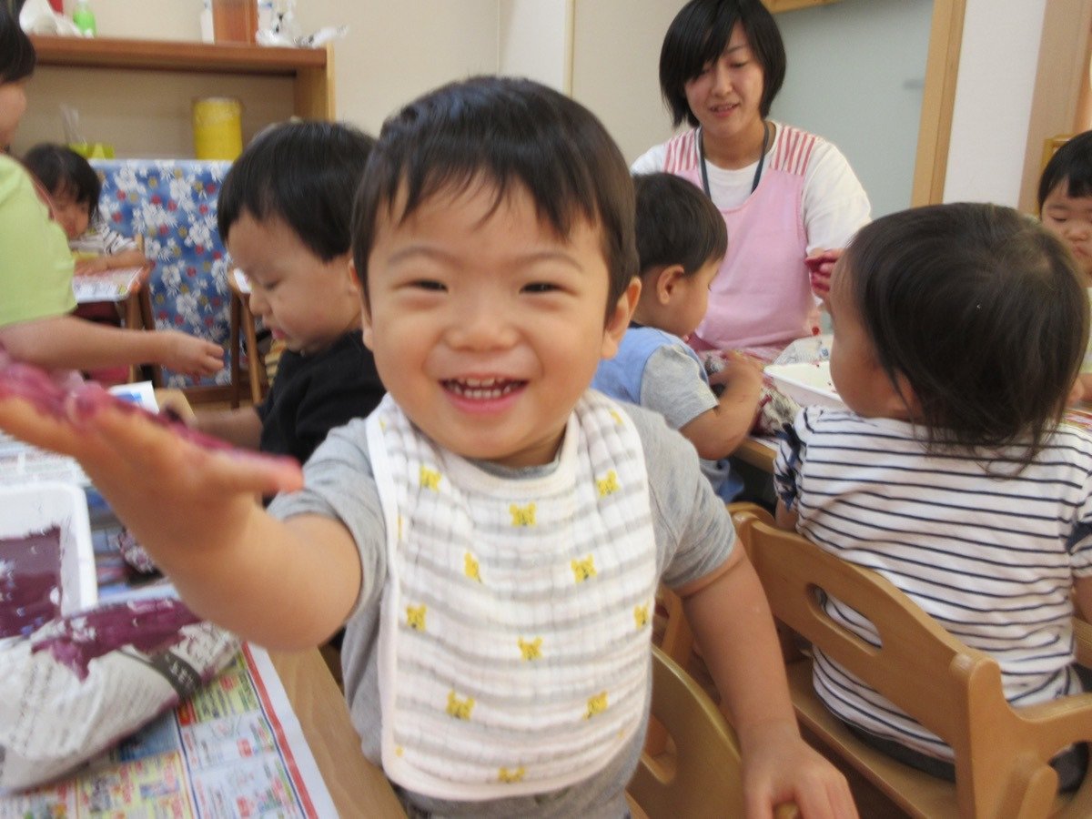 そのお芋に手のひらを使って色を付けて、おいしそうなお芋ができあがり。