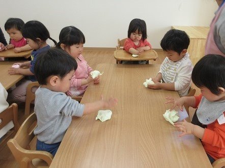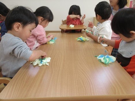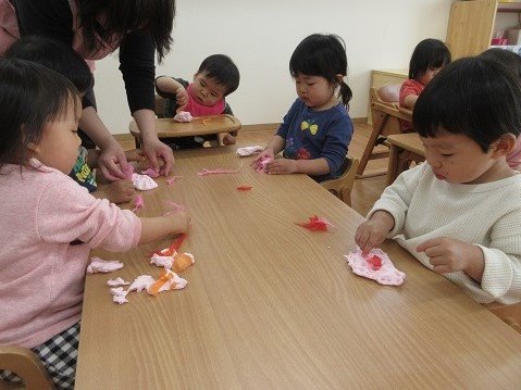 お星さまグループのお友達が、ピンクと緑色の紙粘土をコネコネ。