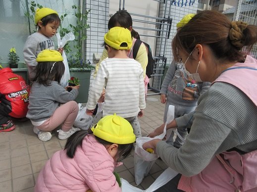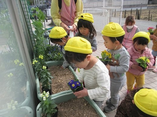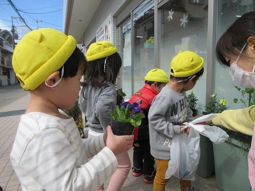 すがすがしく気持ちが良い朝。保育園の前には子ども達がお買い物をしてきてくれたかわいいお花や、