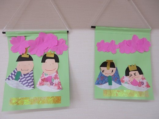 かわいいお花もたくさんつけて、壁に飾れるおひな様ができました。