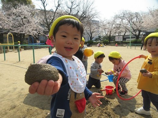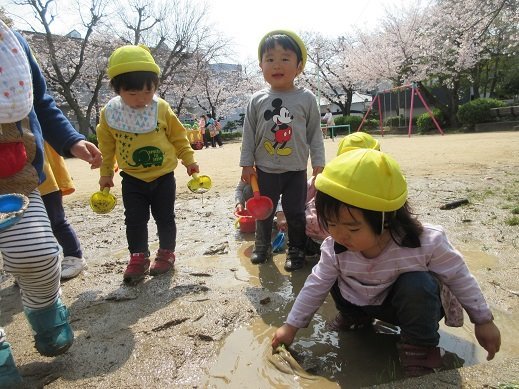 泥んこの感触をひたすら確かめているお友達もいて、保育園に帰る頃にはみんな泥だらけ。
