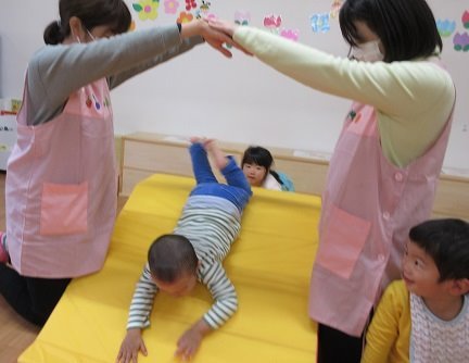 *お布団を丸めてマット遊びや、布団を重ねて、押し入れの上からぴょーん(手を持ってあげてくださいね)