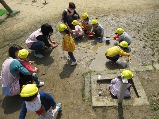「いらっしゃいませ~♪」あっという間にみんな集まって、泥水をすくって遠くに撒くお友達や、