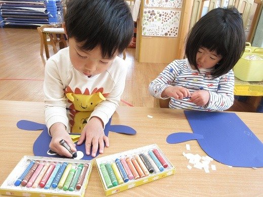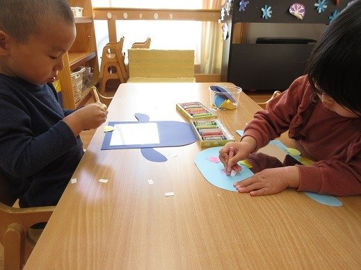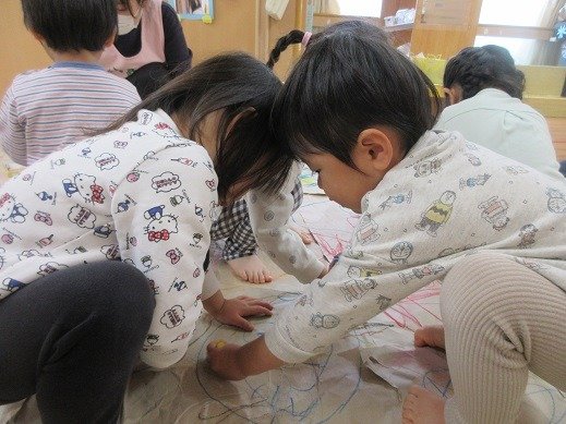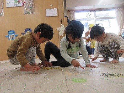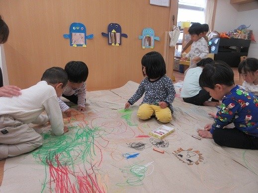 大きな紙に ゴシゴシと 力いっぱいクレパスを塗りこむお友達。「これ、ライオン」「これ、いがぐり」「かまきり描いたよ」「ここは爆発!」いっぱいお話がはずみます。