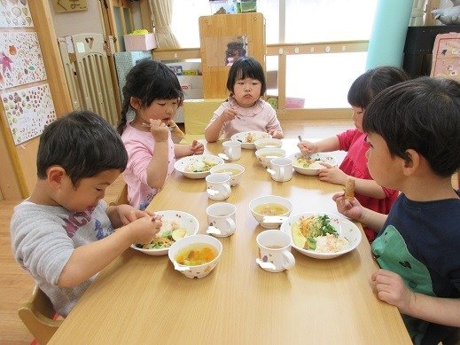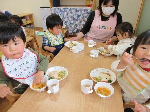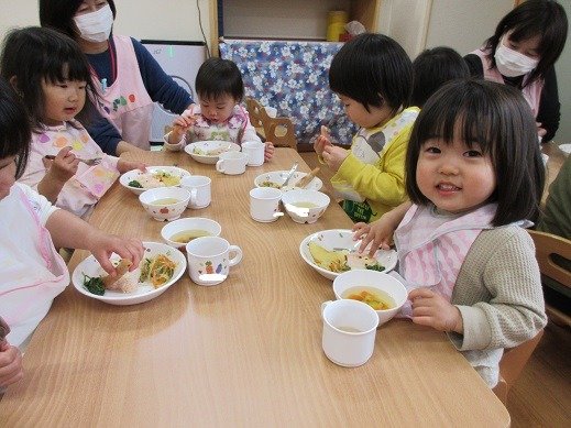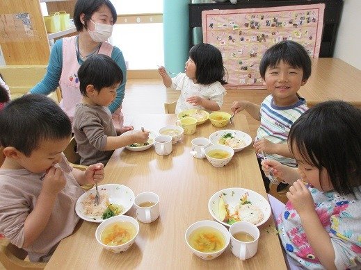 待ちに待った、給食の時間です。さっき抜いたお野菜を確かめながら、カミカミおいしいね~♪(*^-^*) みんな良い笑顔でしょう。