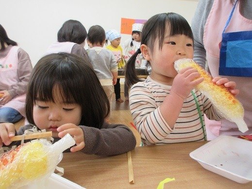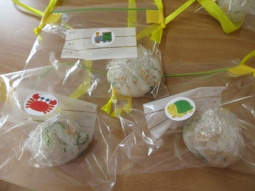 たくさん遊んだらおなかすいちゃったね。自分で作った🍙のお味はいかがかしら?「おいしー!」今日の、おにぎりは*しゃけとネギとゴマのおにぎり *チーズとおかかとじゃこのおにぎり *コーンバターおにぎり の3つの味。やっぱり、コーンバターの人気はすごい☆