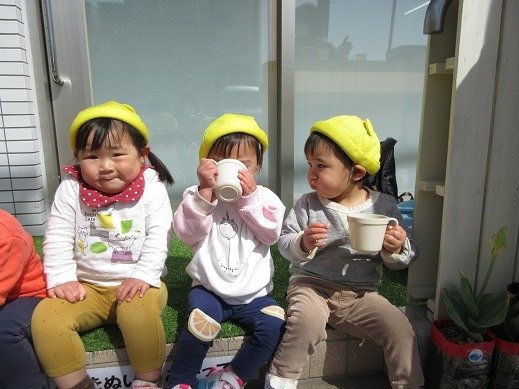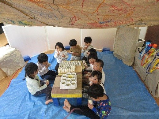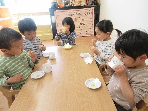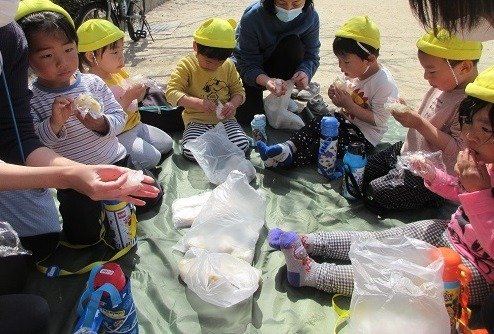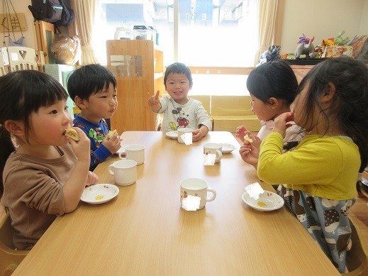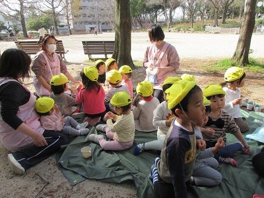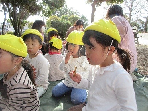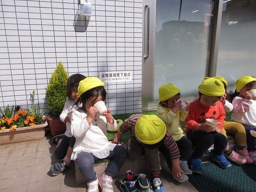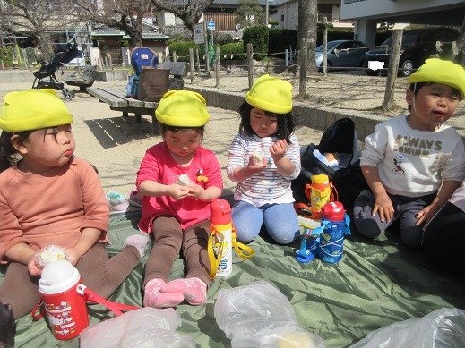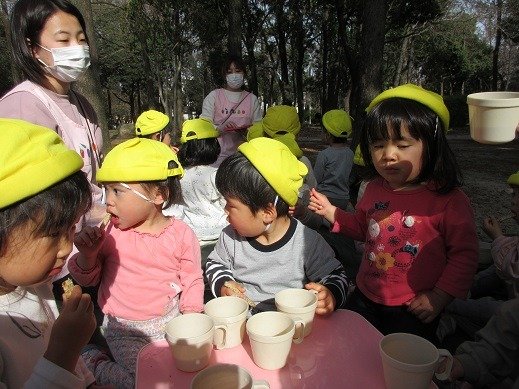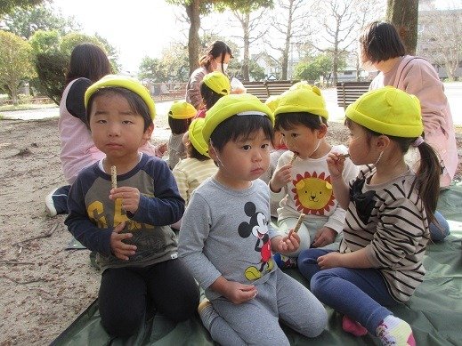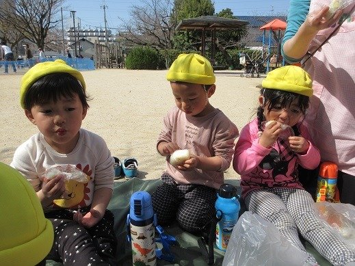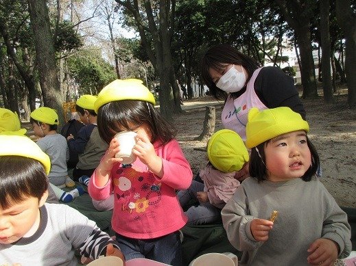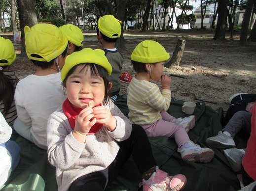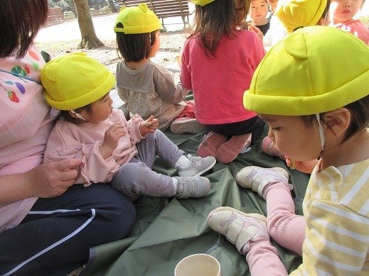 19日は、くま組さんが卒園遠足にでかけます。今日(17日)は、3時のオヤツを公園で食べました。次回は、その時の様子をお伝えしますね!