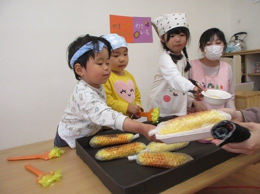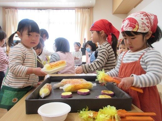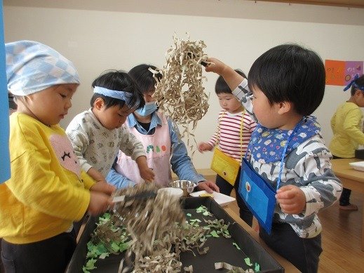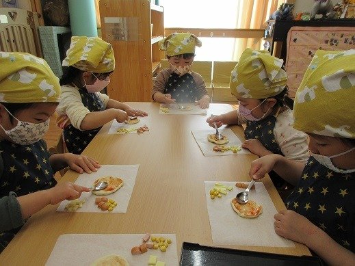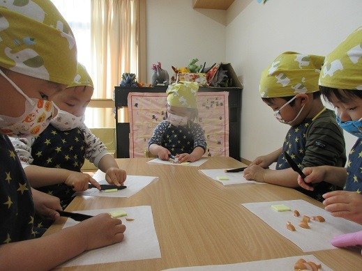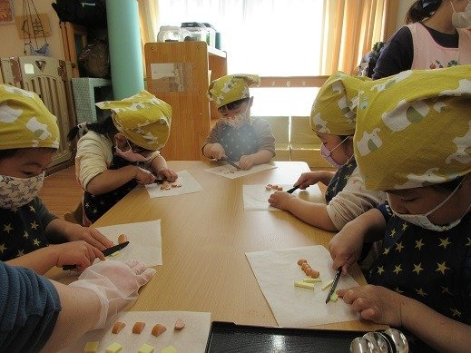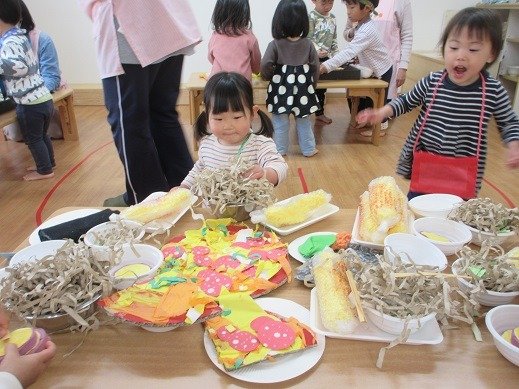 さぁ、みんなも切ってみよう!切るのが楽しくて、コーンも切ってみようとチャレンジしたお友達もいたんですよ。小さくて難しかったみたい。好きな形に切って工夫しています。すごいなぁ。