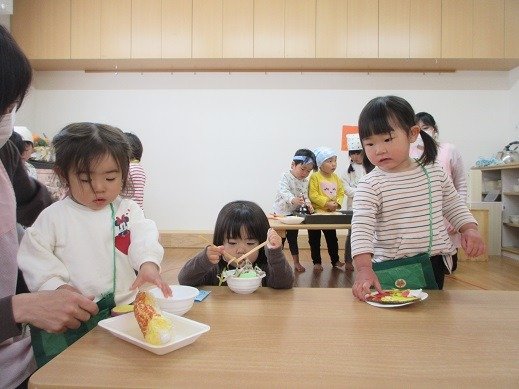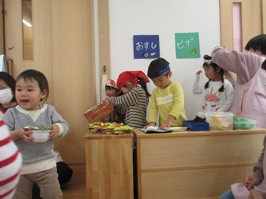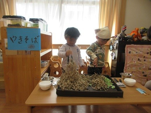 いらっしゃいませ♪お友達と協力しあって、おいしいごちそう作りが始まりました。何ができるかな♪いい香りがしてきた…ような気がしますね。