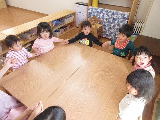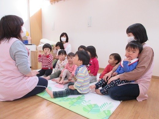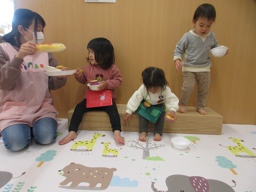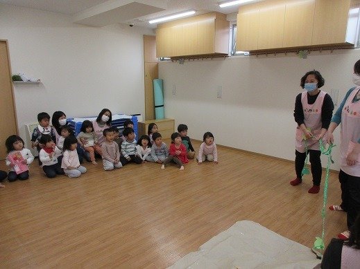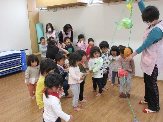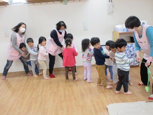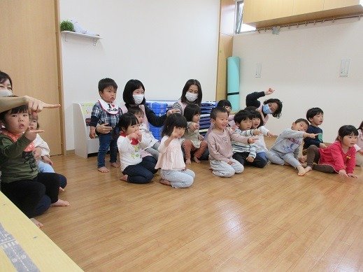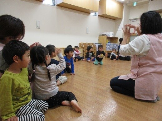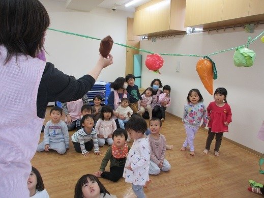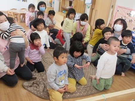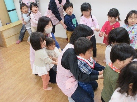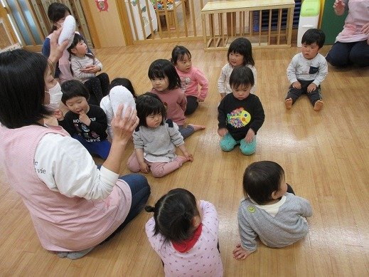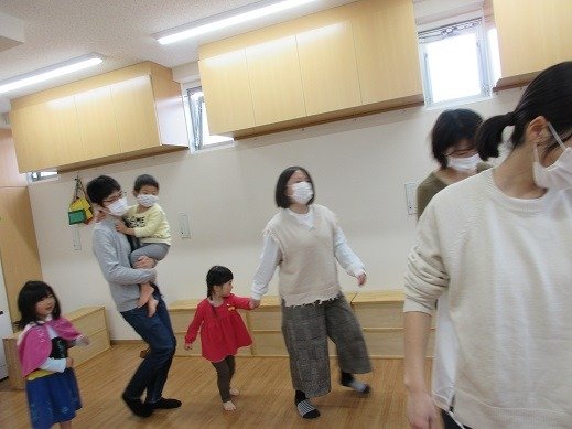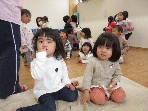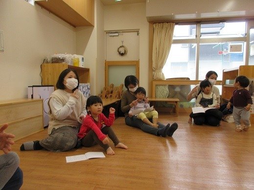 『いっしょにあそぼう』の会では、パパやママのお膝で、一緒に楽しんでくれました。この会は、わらべうた遊びや、製作、お話など、30分ほどですが、親子で楽しく遊べる内容を提案しています。来年度も、年4回、わらべうた遊びを中心に計画していますので、どんどん参加してくださいね!