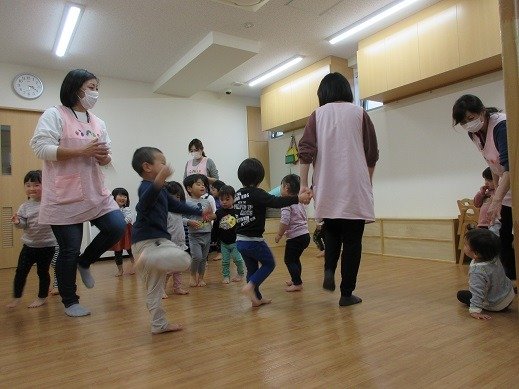 あるこうあるこう…♪先生の歌に合わせて歩きはじめるお友達。お部屋の中を走り回ってあぶないかな?っていう時、この歌声が聞こえると、歩きはじめるなんてこともあるんですよ(笑)