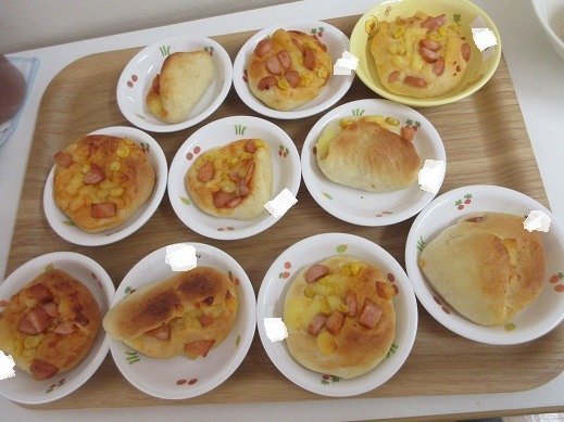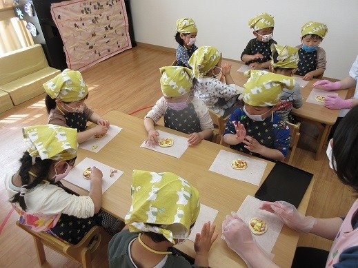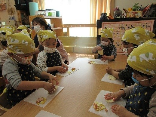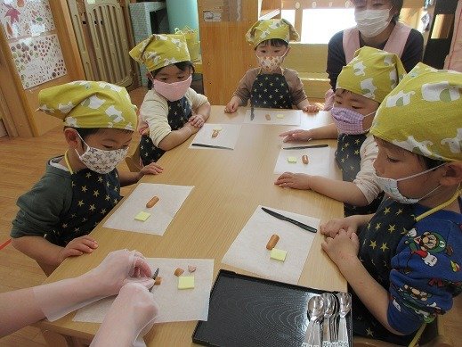 こちらは、くま組さん。今日はね、自分で切った具材をいれたパン作り。先生が切るのを真剣な目でみつめていますね。