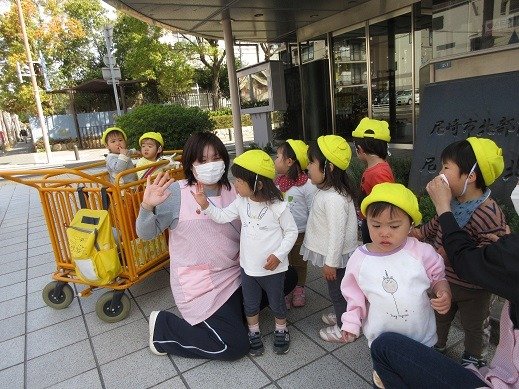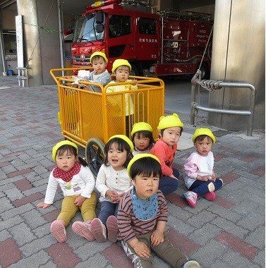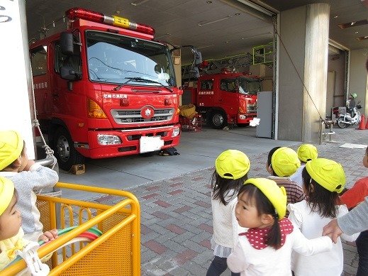今日(19日)は、くま組さんが卒園遠足にでかけました。「いいなぁ~。うさぎ組さんも、ひよこ組さんも行きたいね」ということで、消防車を見に行くことに。ちょっと遠くだけど、「足強いから歩ける!!」ですって。すごいでしょ!かっこいいでしょ!