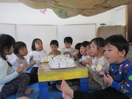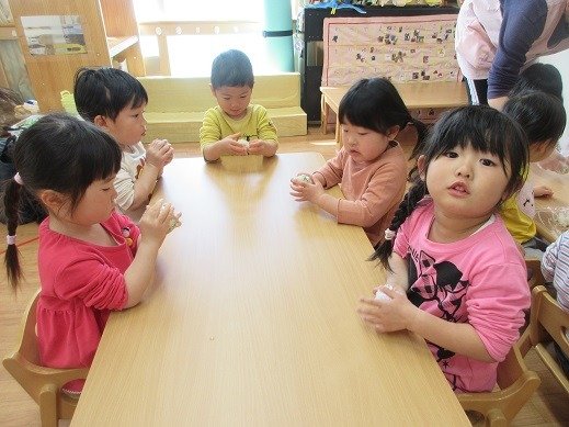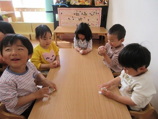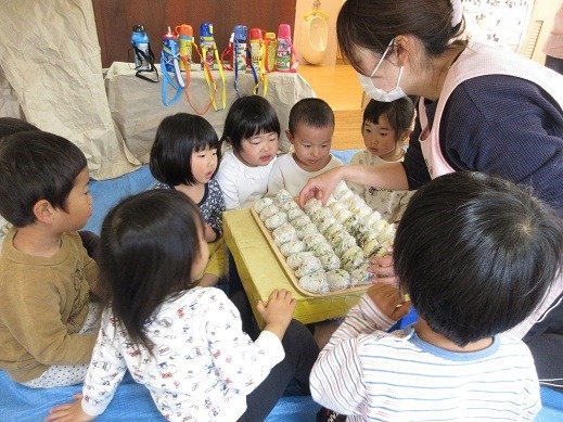1年を通していろいろなクッキングを経験してきたくま組さん。自分で🍙を作って持って行くことにしました。前にね、おにぎりをペッタンコにして、おせんべいを作った事があってね、それを思い出したみたいでペッタンコおにぎりを作った子もいました。