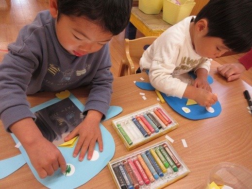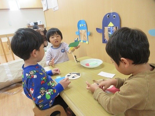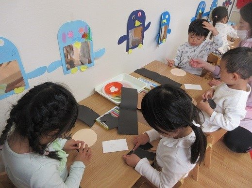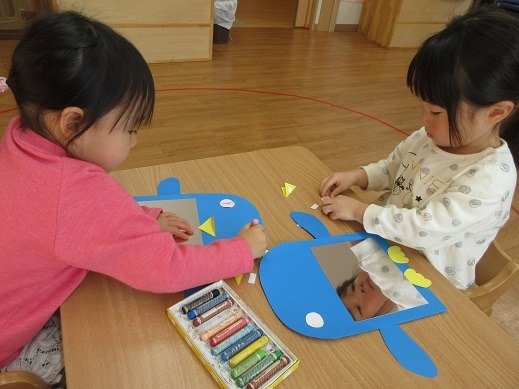 少し前のことですが、くま組さんは、『自分』を作りました。自分の顔ってどんな顔だろうね?ということで・・・かわいいペンギンの鏡を作ることにしました。クレパスを使ってお顔を描いて、とってもユニークな鏡が完成☆