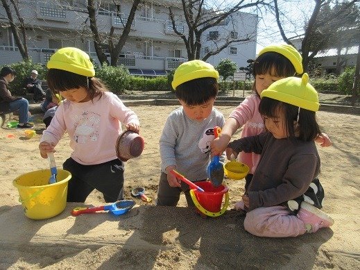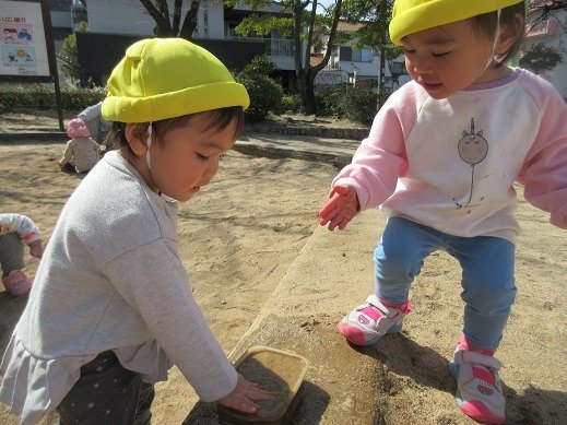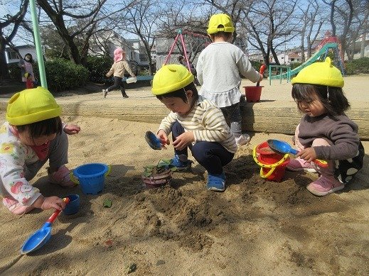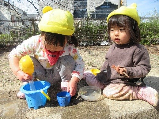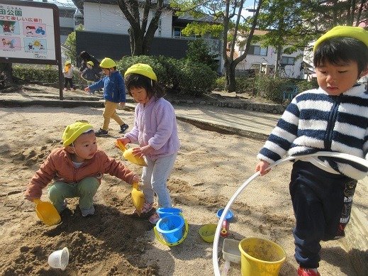 どろんこタプタプ。バケツもグルグル。手の平で泥んこの感触を楽しみながらのごちそう作り。そろそろ、洋服が泥んこになる季節。子ども達は、いーーっぱい泥んこ遊びを楽しむので、お洗濯どうぞよろしくお願いしますね。