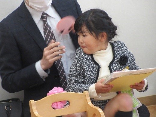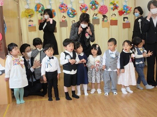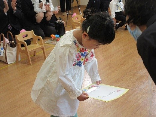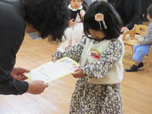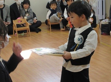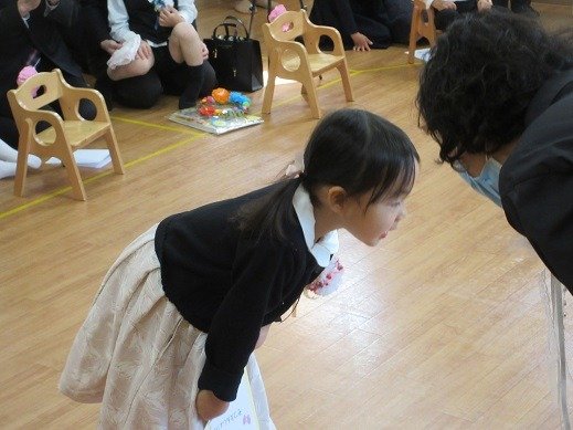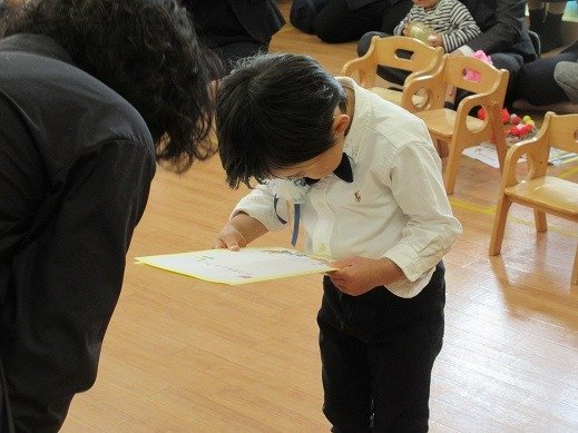 みんなの前に出てきて、ピシっと立って、ぺこりと頭を下げるのも初めて。ドキドキしたね。練習の時は大きな声で「はい!」って頑張ったお友達も、本番はモジモジちゃんに♪それもかわいい!パパやママにはVery Noteで練習風景を見てもらったから、日頃の元気いっぱいの様子をみて安心してもらえたかしら。