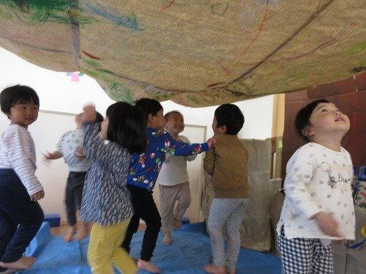 みんなが外でシャボン玉をしている間に、こっそりテントに仕上げ、どんな反応をしてくれるか楽しみで楽しみで。そしたら、この笑顔!!ジャンプジャンプで嬉しい気持ちを表現してくれました(先生達も嬉しい!!)