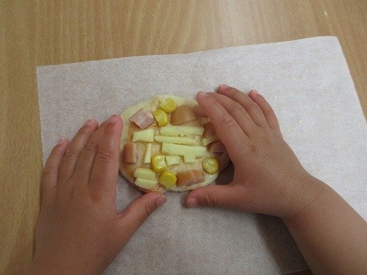 のせましたーっ!これを…半分に折って包み込むんです。具がいっぱいでうまく折りたためなくて困っていると、先生が「いいやん!ピザ風で、おいしくなるよ」と、声をかけてくれたので、そのままピザ風にしたお友達も。それぞれ自分の特別パンだものね。