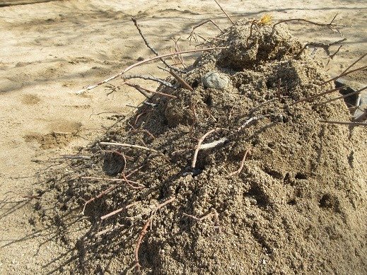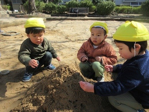 お友達と一緒なら、大きなお山もあっという間に完成!手を使って、周りをしっかり固めるのもお手の物♪木の枝をさしてアーティスティックなお山ができました。