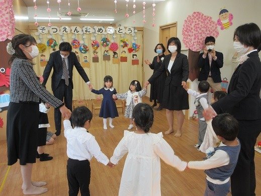 卒園式の歌をうたっていると、星グループさんも一緒に大きな声でうたってくれています。おててをつないで、ゆらゆらさせて、本当にかわいい!去年の今頃、こうして、おててをゆらゆらさせていた子ども達が、卒園するだなんて。卒園の歌が流れると、思い出がいっぱい出てきてウルウル「涙が出てくる~っっっ」と泣いてしまうので、くま組さんは、歌いながら不思議そうな顔をしているんですよ(笑)
