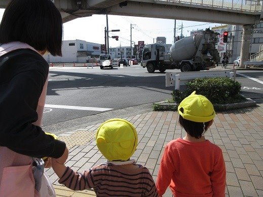 大きな通りを歩くと、みんなが大好きな車に会えました。「ミキサー車!!」