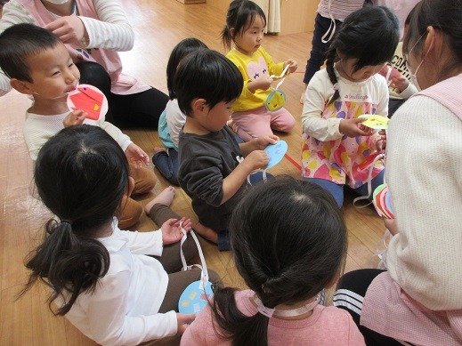 星グループさんから、かわいいお花をもらったくま組さんは、お礼に、折紙で作ったチューリップメダルをプレゼント。