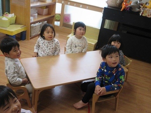 「くま組さん、いっぱい遊んでくれたね」先生のお話を聞いている星グループさん達。