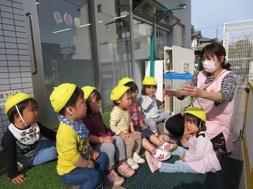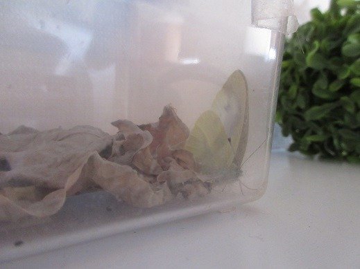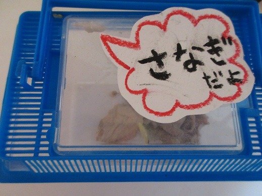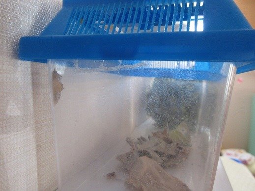 さなぎが3つ。生きているかな、動かないね。昨年度のくま組さんが気にかけてくれていたこの虫かご。