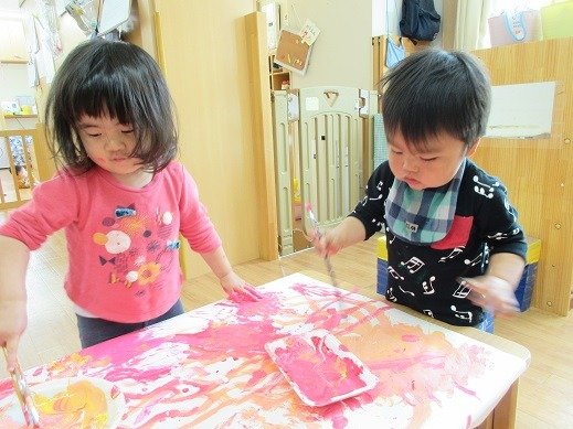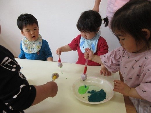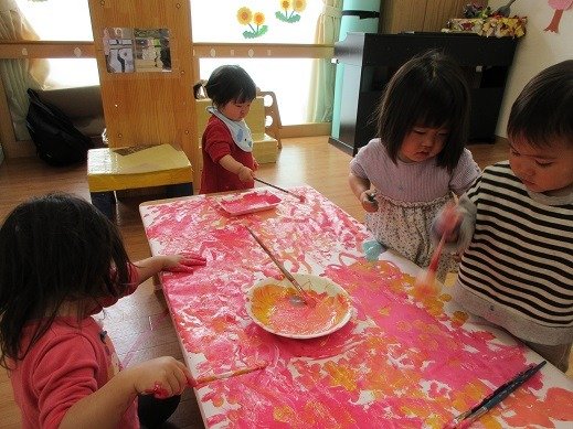 太陽グループさんは絵の具遊び。大胆にぬたくり遊びができるところはさすがです。星グループさんも、スタンプ台でペッタンと、足型をとっています。絵の具の感触や、砂、泥んこなどの感触に慣れていないお友達は、困ったお顔で先生に「気持ち悪いよ~」を伝えてくれます。ひとつ、感触を覚えたね♪と嬉しくなりますね。