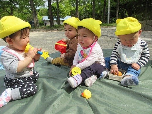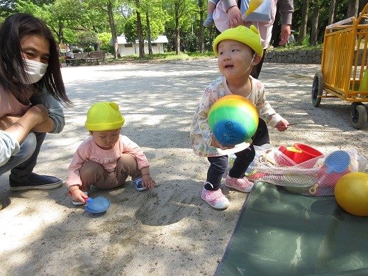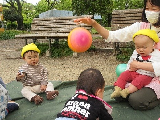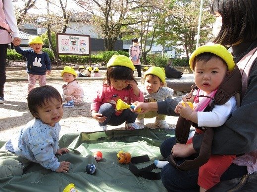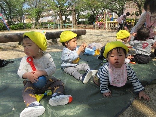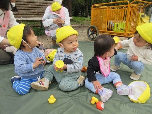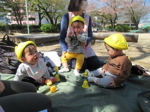 公園につくと、レジャーシートを敷いて、お花見気分。くま組のお友達も、「赤ちゃんがどうかな~と思ってな」なんて言いながら、靴を脱いで仲間入りしてくれます。