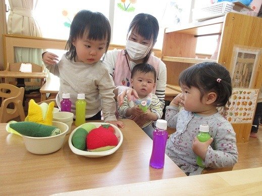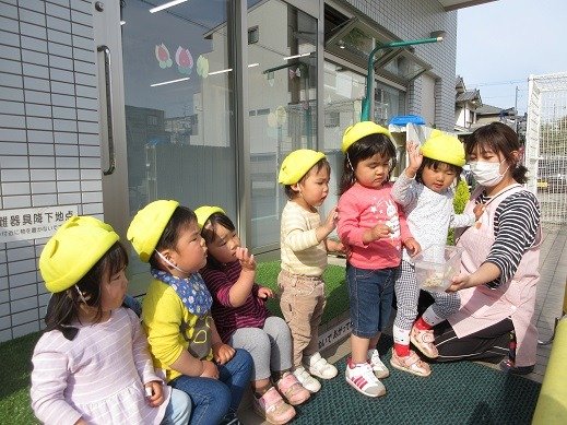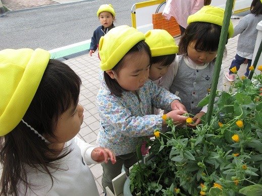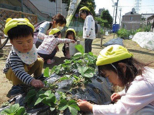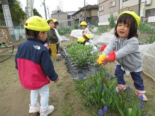 4月1日、お友達12名を迎え新年度が始まりました。太陽グループ(2歳児、1歳児混合クラス)は、プランターのえんどう豆を収穫したり、農園にでかけました。農園のチューリップや、イチゴもお花が咲いていて、「みんなよく来たね」と迎えてくれました。