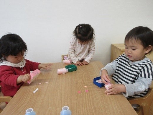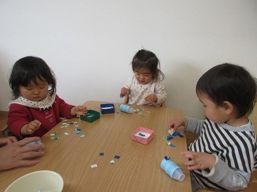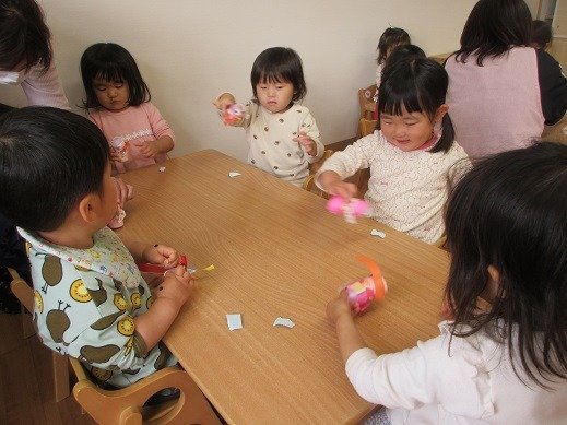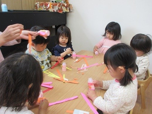 うさぎ組さんは、ヤクルトの容器に巻いてある両面テープに、紙をペタペタ。紙も切って用意してくれていたものです。ぎゅっ!ぎゅっ!両手を使って、かわいいのができそうね。