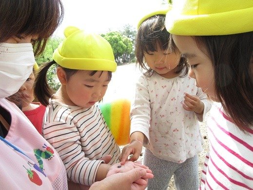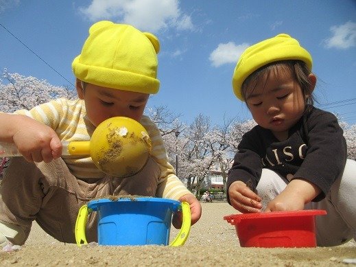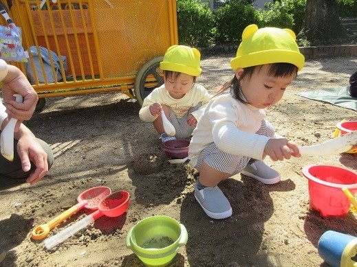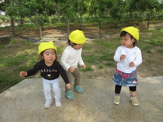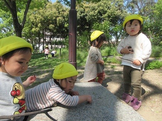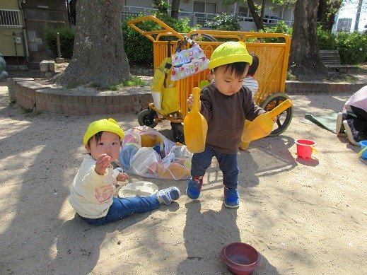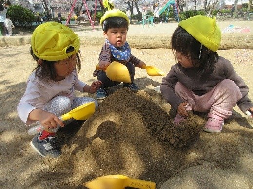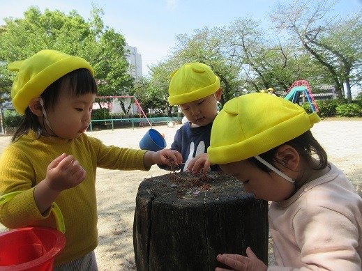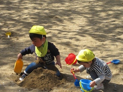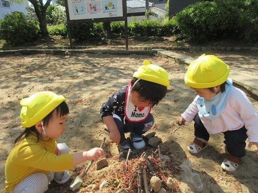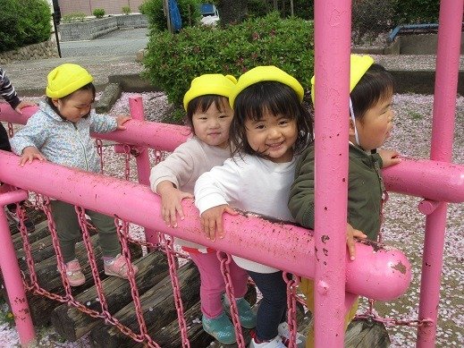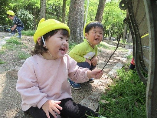 誰かが作っていた素敵な物を見つけて、さっそく続きを楽しませてもらいました。公園に行くと、思いつかなかった遊びのアイデアがあっておもしろいですね。園生活に慣れてきて、行動が活発になりはじめました。転んだ時に手を付けない子どもが増えていると言われていますね。しっかり体を使って遊ぶ事で、体の上手な使い方を覚えていくので、安全に見守りながらも、いろんなチャレンジをさせてあげたいと思っています。