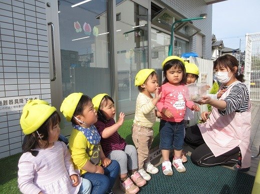 「ばいばーい」ヒラヒラ~ととんでいくチョウチョさんをみんなで見送りました。またお散歩のどこかで会えるといいね。