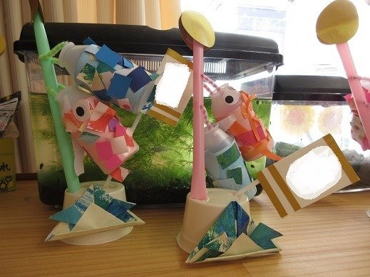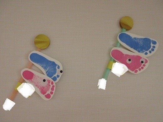 長いのをペッタリと貼り付けてみたり、それぞれの個性がキラリ☆「できたよ~。およいでるわ」と泳がせて嬉しそうですね。いいのができたね!星グループさんは、かわいらしい足型のこいのぼりができました。