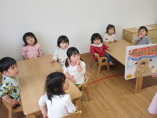 太陽グループのお友達が絵本を読んでもらっています。集中してみていますね。こいのぼりのお話なんですよ。散歩で、大きなこいのぼりを見るのが嬉しくて。それで、こいのぼりを作ることにしました。