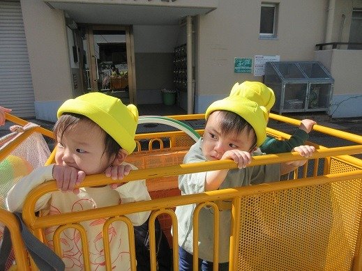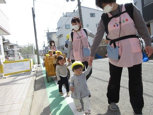新入園児さんは初日からぐるっと散歩へ。お顔いっぱいに涙と鼻水で、ママを探して泣いているお友達も、外の空気に触れると気持ちが少しかわるようで、泣き止んで辺りをキョロキョロ。「いってらっしゃ~い」と手を振ると、振りかえしてくれたりします。