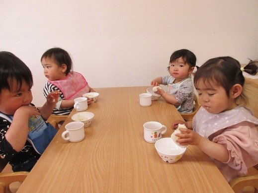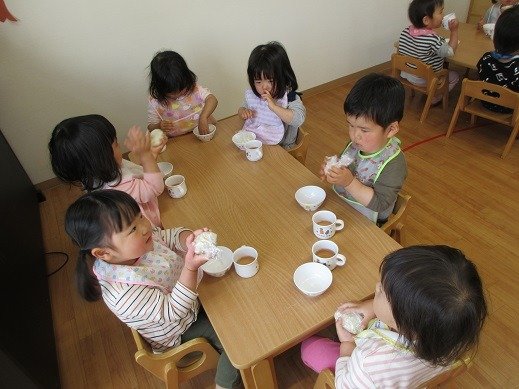 くま組さんは、おやつに、自分でおにぎりを作りました。「コーンがはいってるわ」楽しそうな笑顔が印象的☆