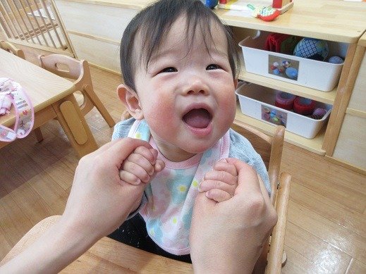 お部屋の中でも、好きな玩具や気になるものを指差しして、先生と目を合わせて伝えてくれています。先週まで「え~ん え~ん」と泣いて、先生にしがみついていたお友達も、行動範囲が広がり、どの先生にもニッコリ微笑んでくれるようになりました。先生達、キュンキュンです(笑)