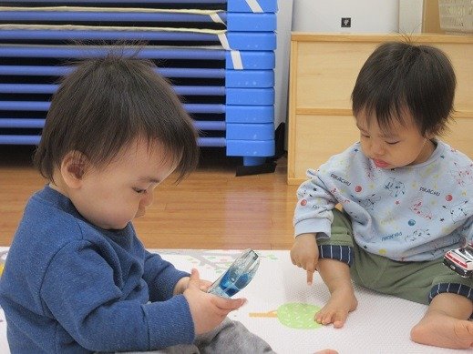 お友達のしていることが気になって、真似っこしてみたり、お世話をしたりしています。少し大きくなったら、相手にも、自分と同じ気持ちがあることを知っていきます。それまでは玩具の取り合いや、場所の奪い合いなんて場面も見られます。仲良くできていないわけではないんですよ。成長の段階だね!と、楽しみに見守っていてあげたいですね。