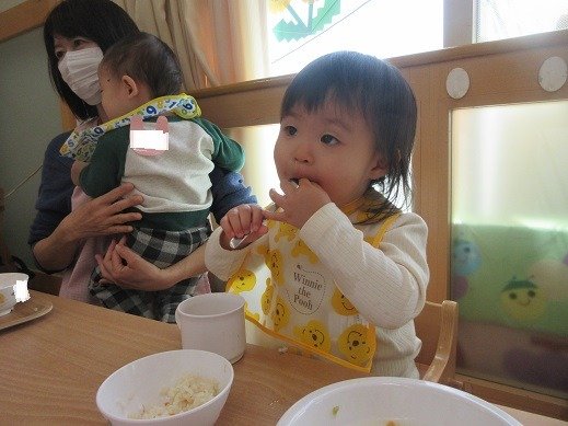 朝のおやつや給食を、モグモグ食べてにっこり。「うちの子は慣らし保育がすすんでいないけれど大丈夫かしら…」そんなママもいらっしゃるかもしれませんね。慣らし保育は、初めて親の元を離れる子どもたちのために、そして子どもを預ける保護者の方のために、少しずつ、保育士や園での生活に慣れていってもらう期間です。慣れるまでは人それぞれ。安心してくださいね。些細な事でも不安に思った時は、保育士にお話してくださいね。