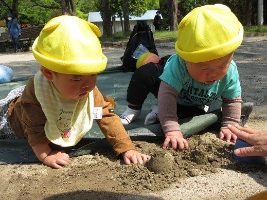 お外では、レジャーシートを敷いて心地良い時間を過ごしました。砂を掴んでは、サラサラ~とこぼれる様子をじーっと見ている姿が、とてもかわいいです。
