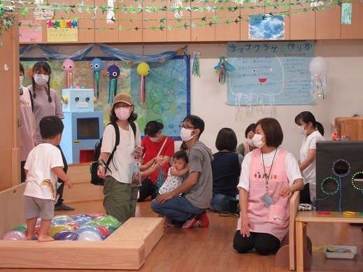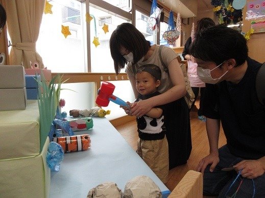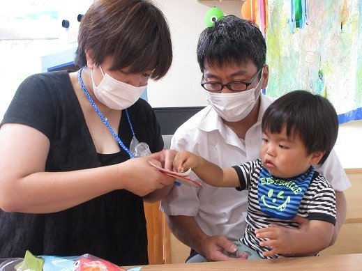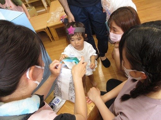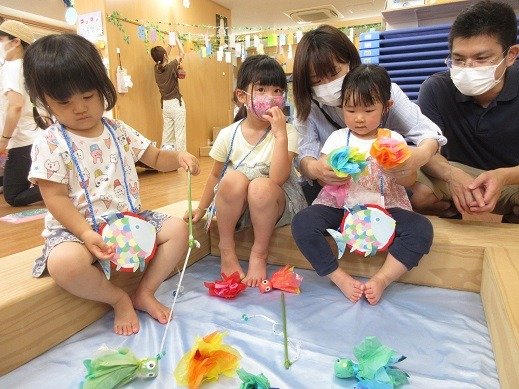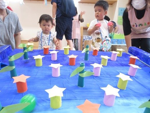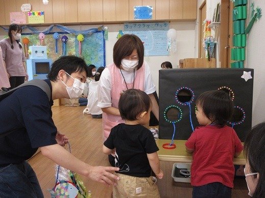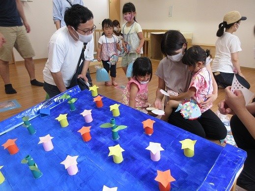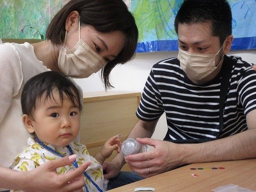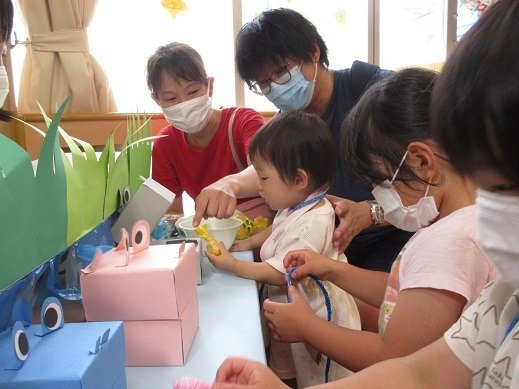 【製作コーナー】今年はくらげを作りましたよ。パパママと一緒に、目を貼ったり模様をつけてゴムをつけたら完成!