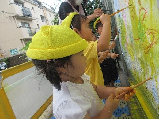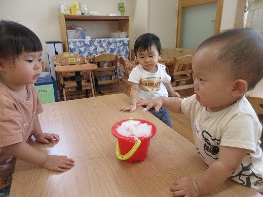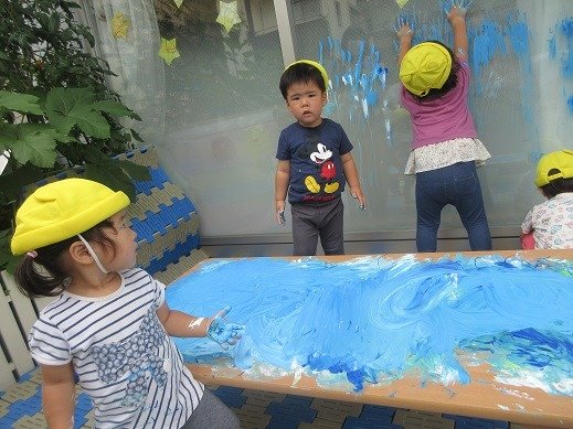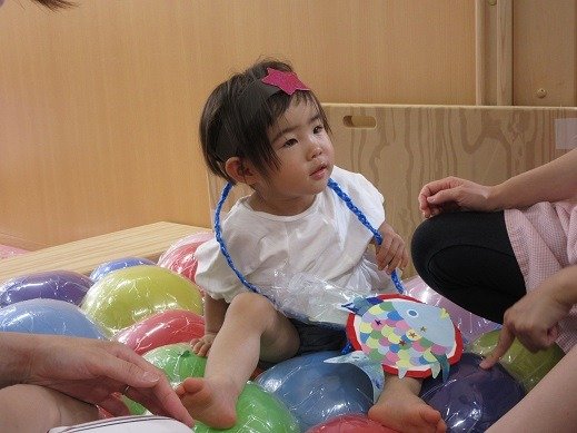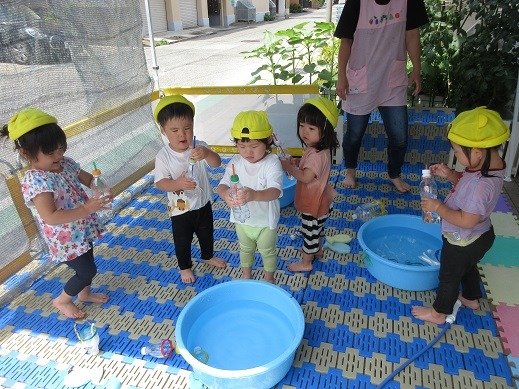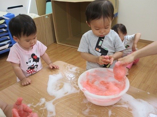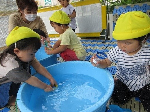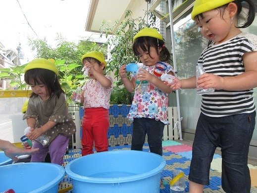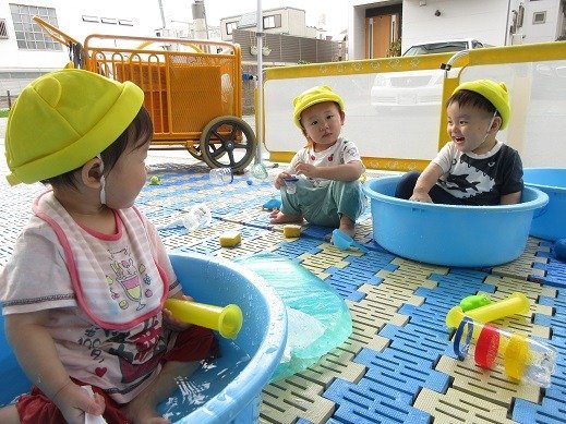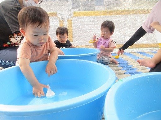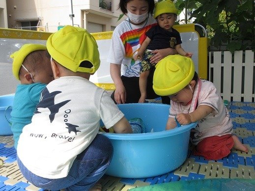 いつもと違う場所や環境に戸惑いながらも、タライの水に手を伸ばして「きもちいいね~」「お水ピチャピチャだね」水の気持ちよさを感じながら楽しんでいます。