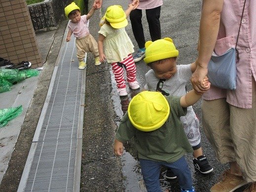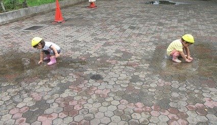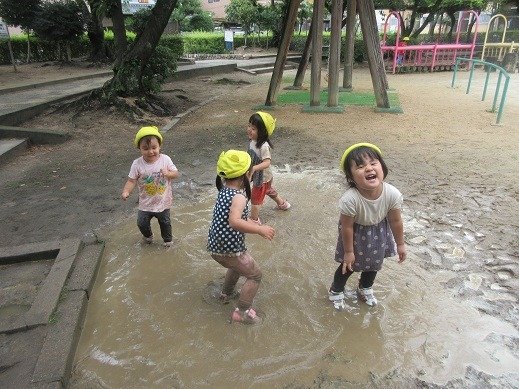 雨上がりの公園には 大きな大きな水たまりがあって、「やったー!!!」子ども達も先生達も大喜びです。バシャバシャ!♪ながぐつはいてるねドンドン♪みんなで水たまりの中をバッシャバッシャと歩いたり