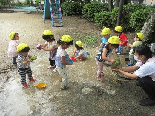 泥んこをすくって 先生にはいどうぞ。ズボンも洋服も お顔までどろんこ。