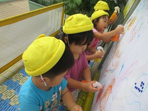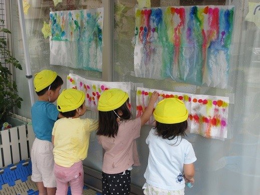 そんな雨の日は、軒下で遊びました。霧吹きに絵の具を入れて、シュッシュッ!色がついたよ。両手でシュッ!二つ持ってシュッ!