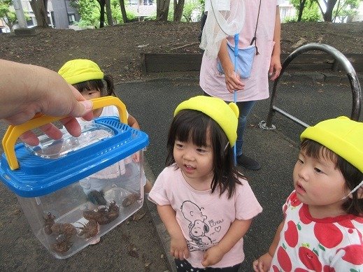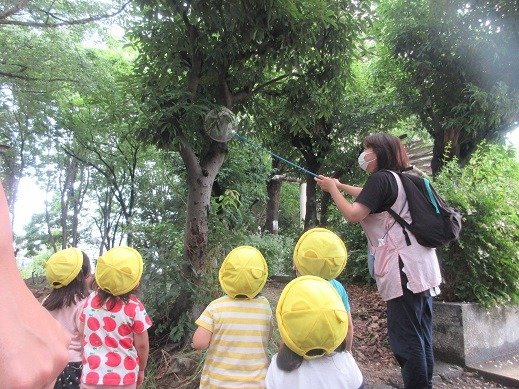 セミと、セミの抜け殻をたくさん集めて、保育園で待っている星グループさんに見せてあげようと帰ってきました。